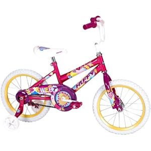 Product DescriptionMade by Huffy, this girl's bicycle is pink and purple and sports 16-inch wheels along with an oversized diamond steel frame. The padded, integrated seat and soft, mushroom-style PVC handlebar grips offer greater comfort. Graphics appear on the frame, seat, and chain guard. Other features include rear coaster brakes, training wheels, a one-piece steel crank, and a leading-edge steel fork. The wheels are 1.75 inches wide. The bike weighs 22 pounds and is recommended for girls ages three to six years old.